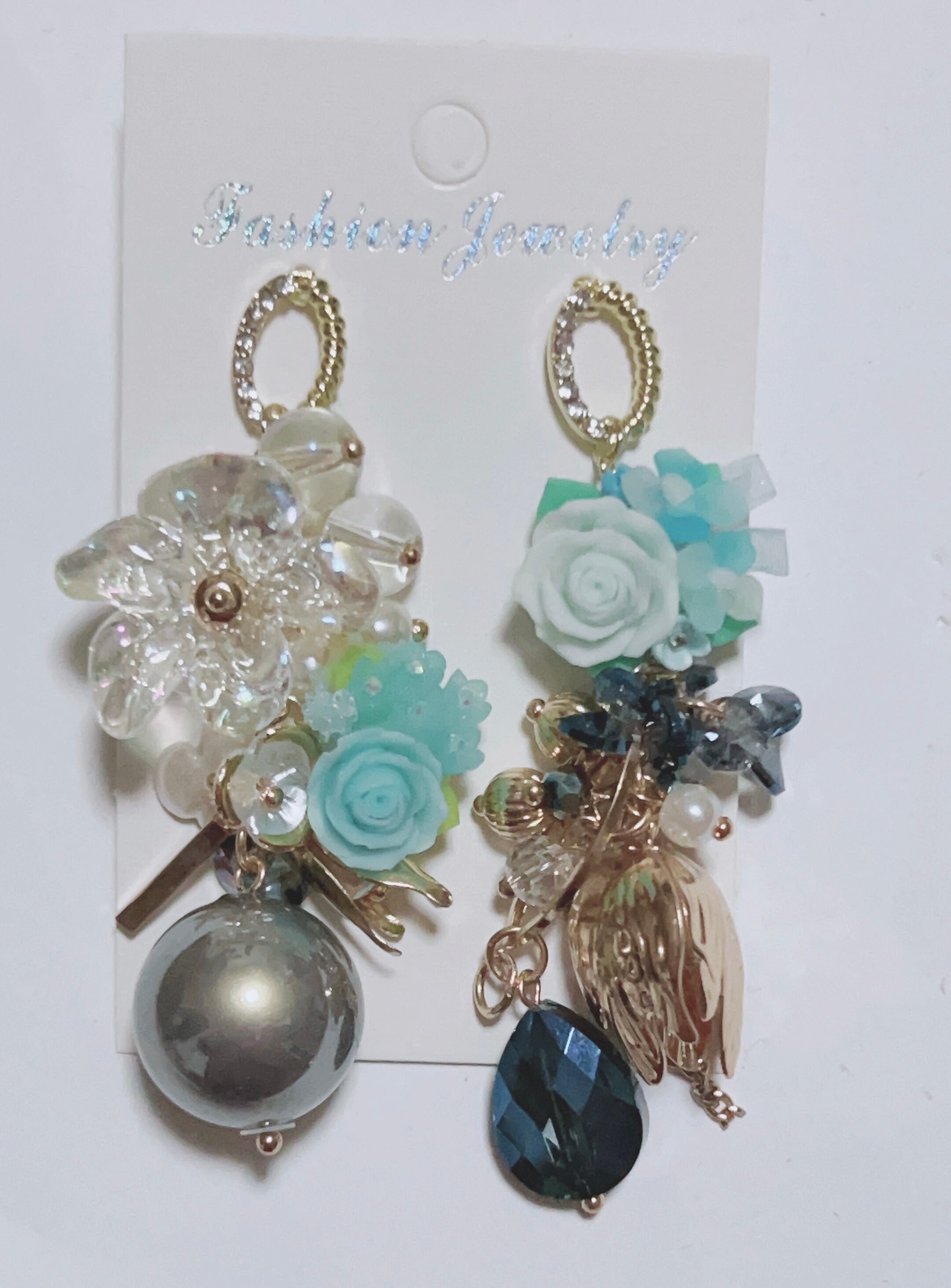 樹脂薔薇、パールチェーン、クリアストーンを組み合わせて作った大人かわいい、ピアスになります。