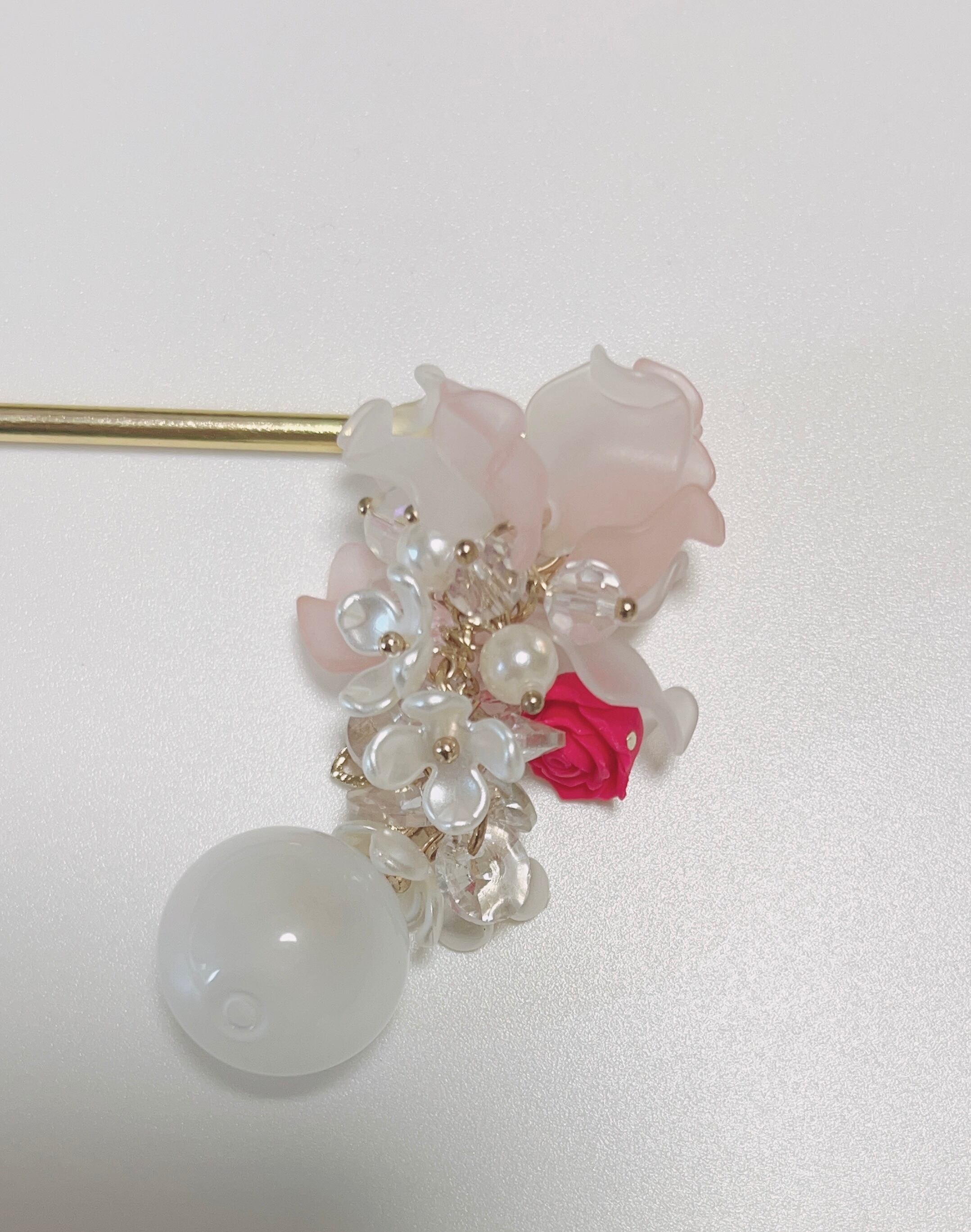 樹脂薔薇とビーズを使ってキラキラに仕上げたハンドメイドな簪です