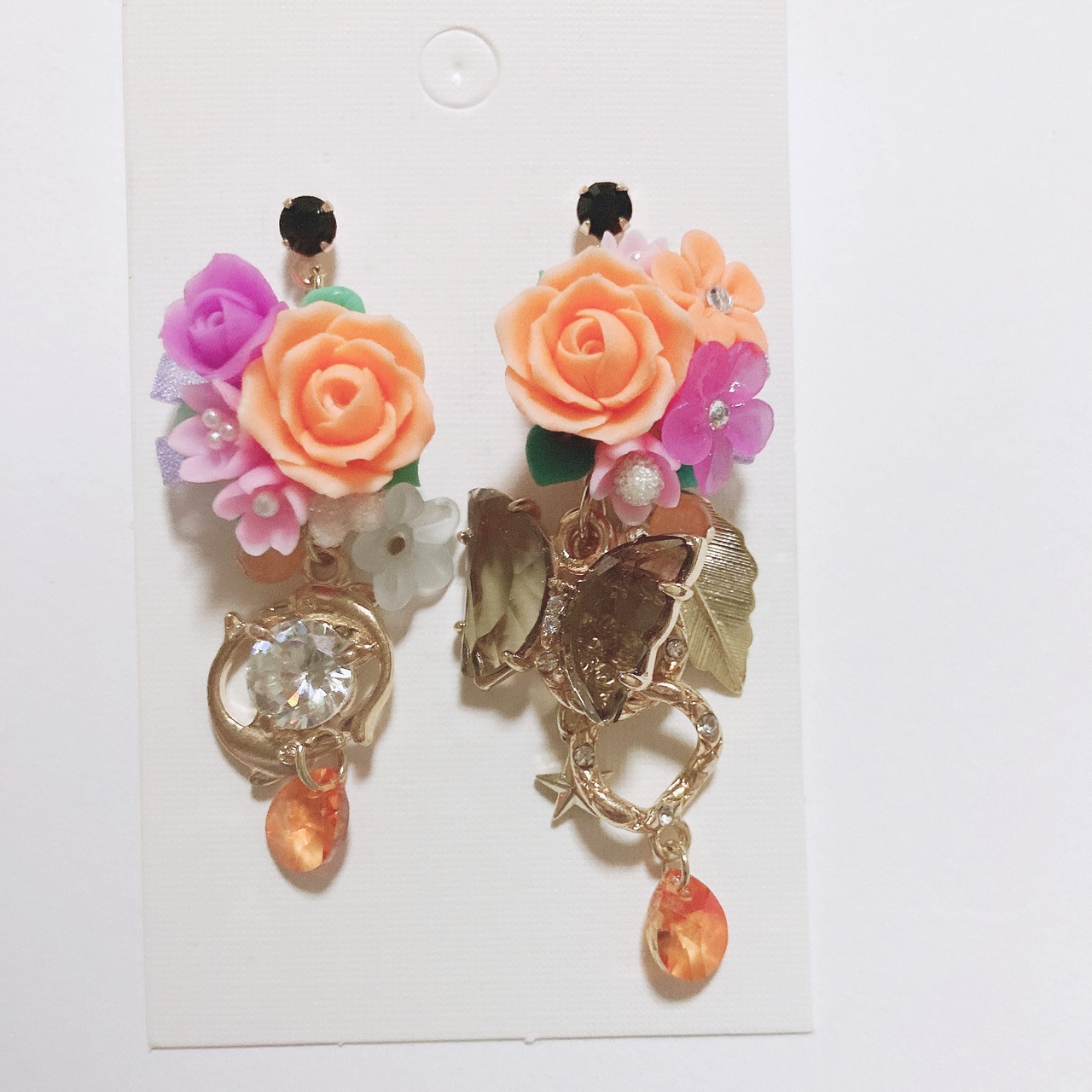 樹脂薔薇とスワロフスキーを使って仕上げたデザインのピアスですハンドメイドです イヤリングへの変更も可能です。 イヤリング変更はトップ部分がなくなります。また プラス100円かかります。 推しカラーに仕上げました。 1点ものになりますのでほかサイトで売れたら削除します