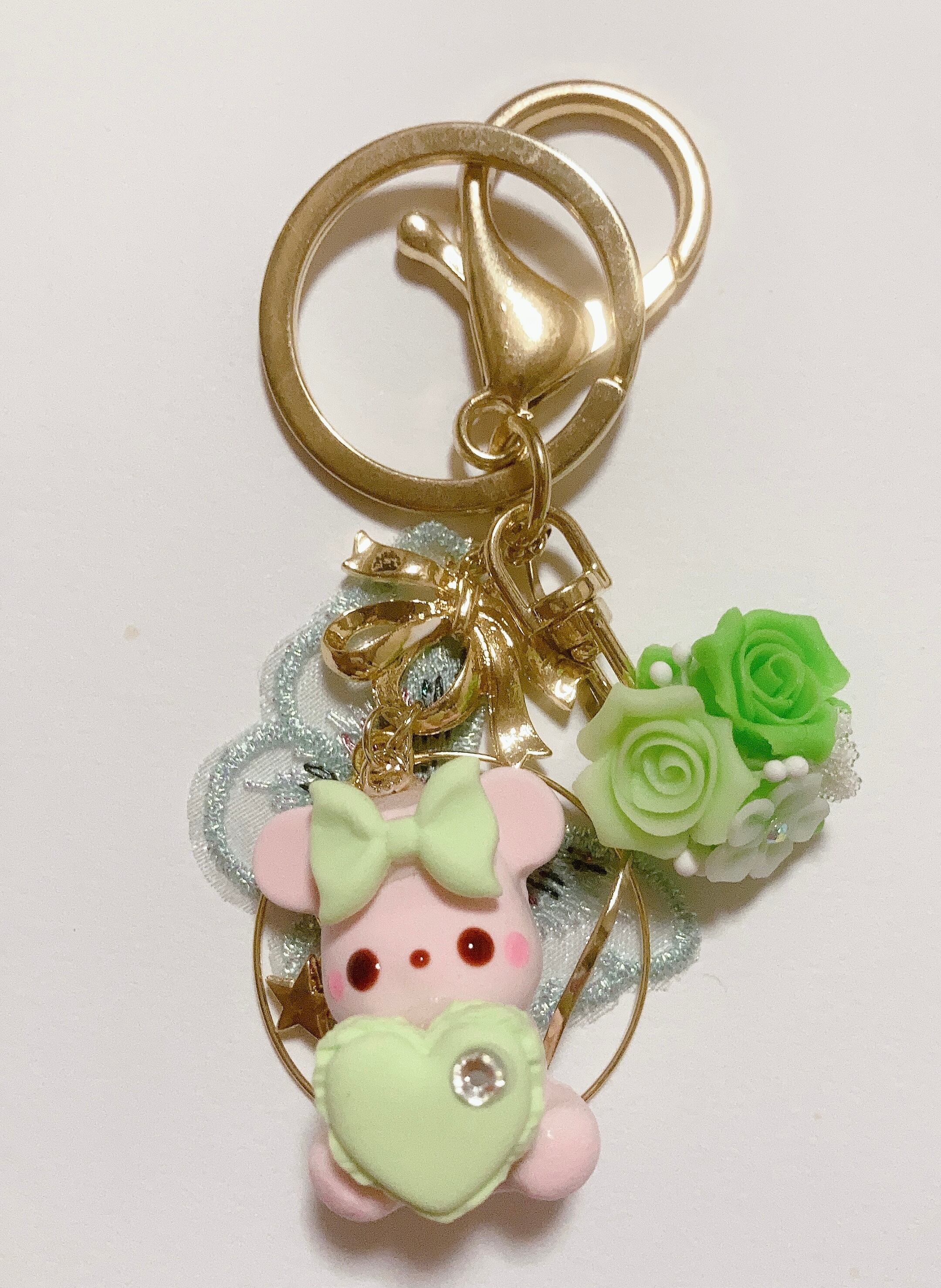 (緑)クマと樹脂薔薇のバッグチャーム キーホルダー ハンドメイド