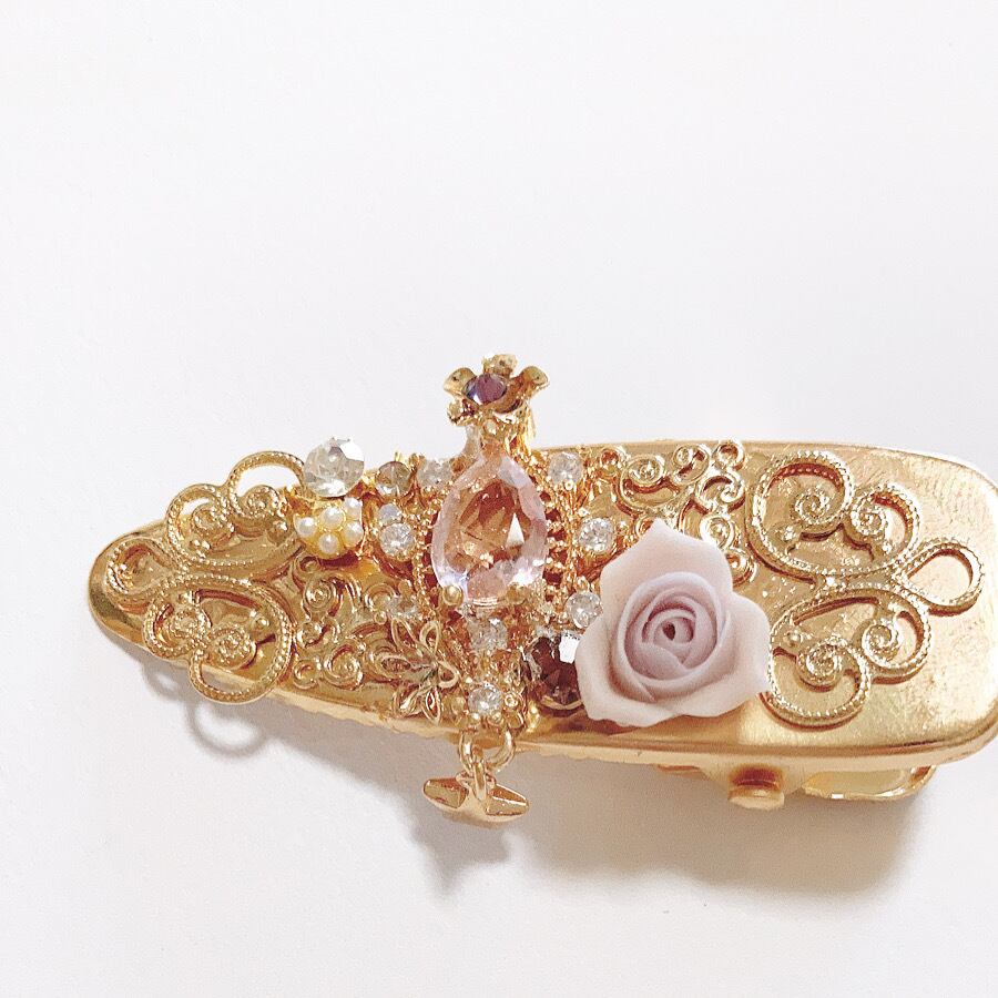 樹脂薔薇と金属チャームとスワロフスキーの組み合わせで作り上げました。大人かわいいティアラの様な仕上がりです。