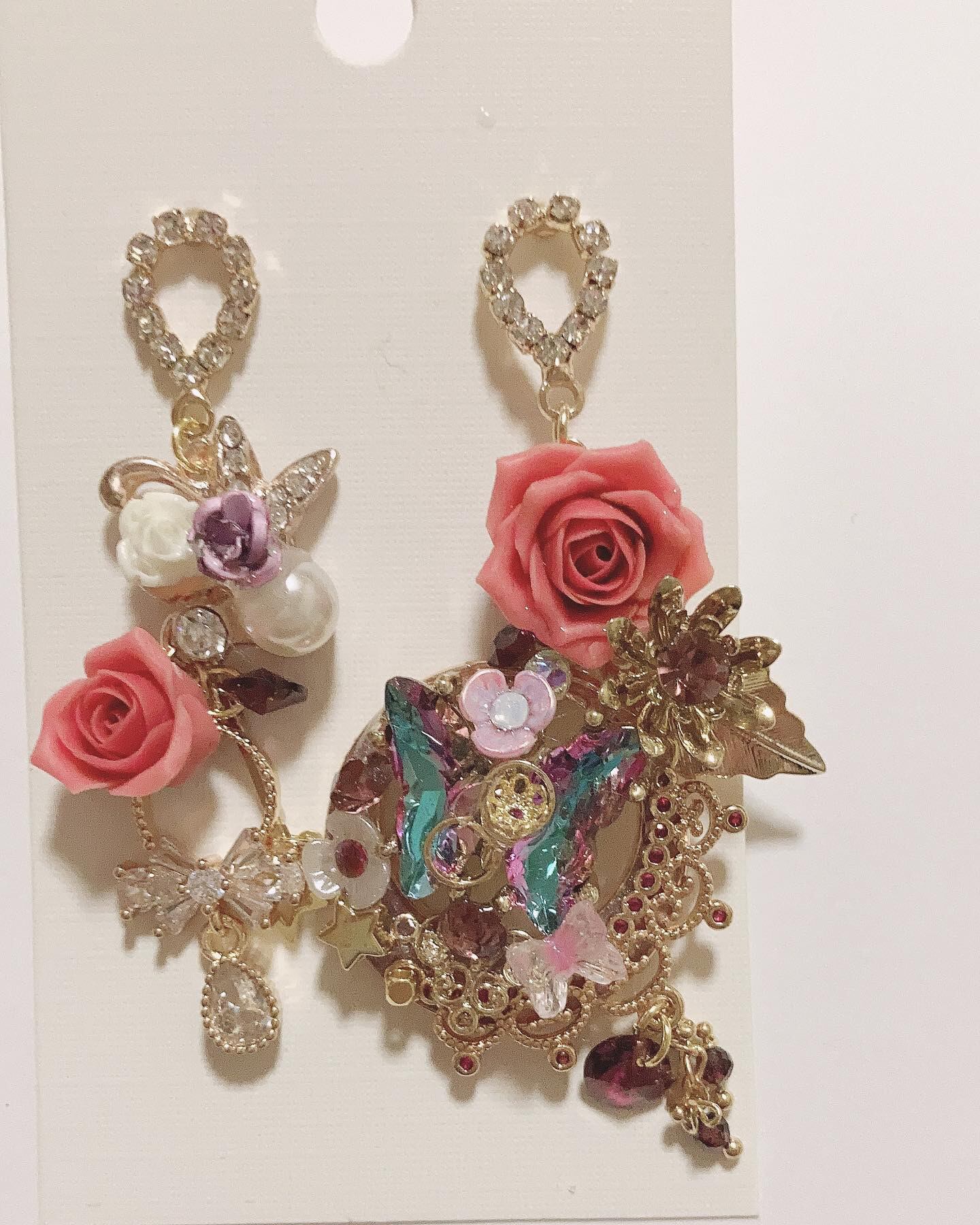 樹脂薔薇とスワロフスキーの組み合わせで作ったデザインポストの大人かわいいピアスです