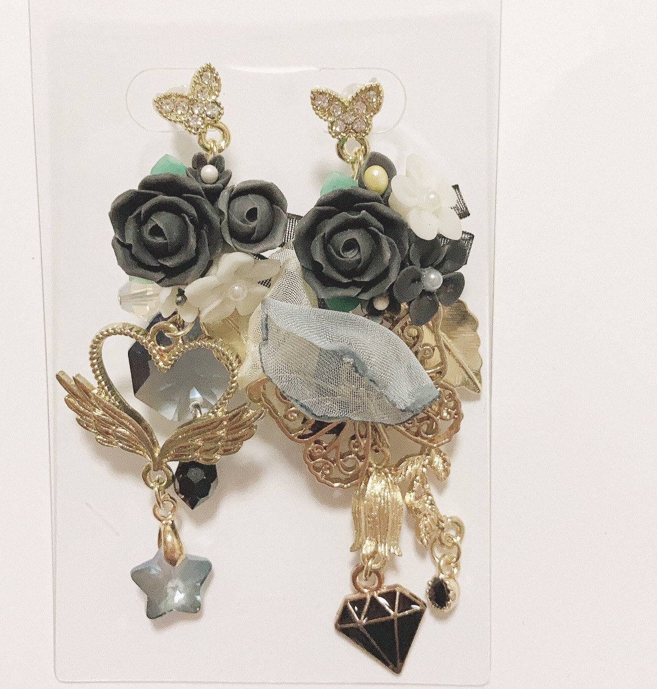 樹脂薔薇とスワロフスキーの組み合わせで作ったデザインポストの大人かわいいピアスです