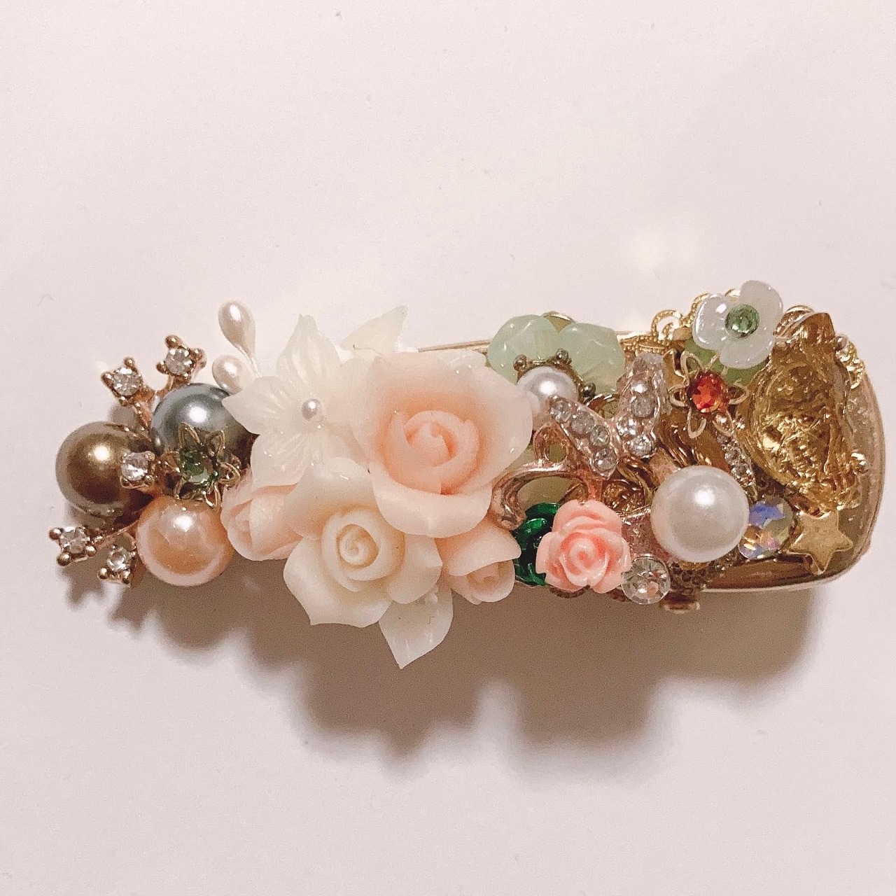 樹脂薔薇と金属チャームとスワロフスキーの組み合わせで作り上げました。大人かわいいティアラの様な仕上がりです。