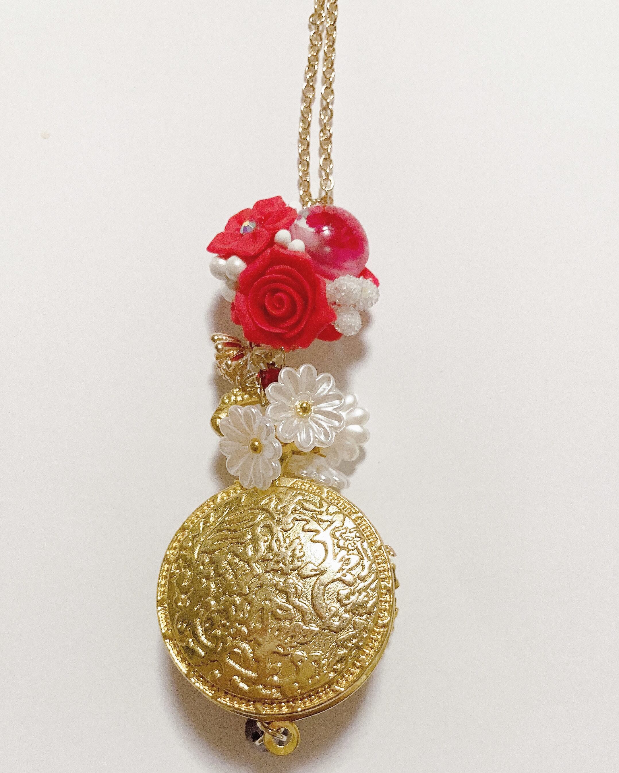 トップの部分はパーツでデコレーションしたため、完全には蓋は閉まりませんが、3デザインでネックレスが楽しめる仕様になっています。
