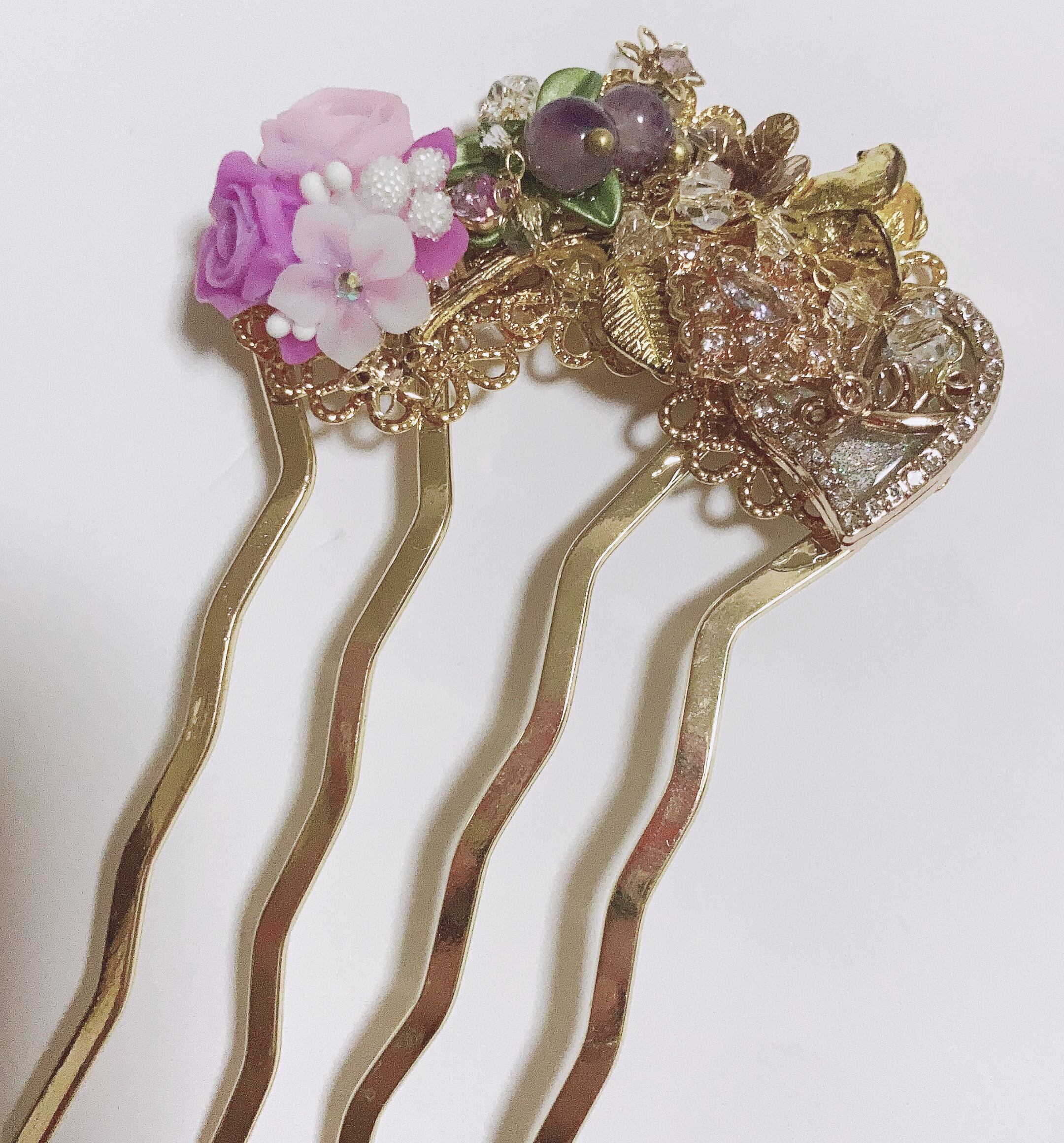 樹脂薔薇や透かしパーツ、ジルコニアを使ってキラキラに仕上げたヘアコームです