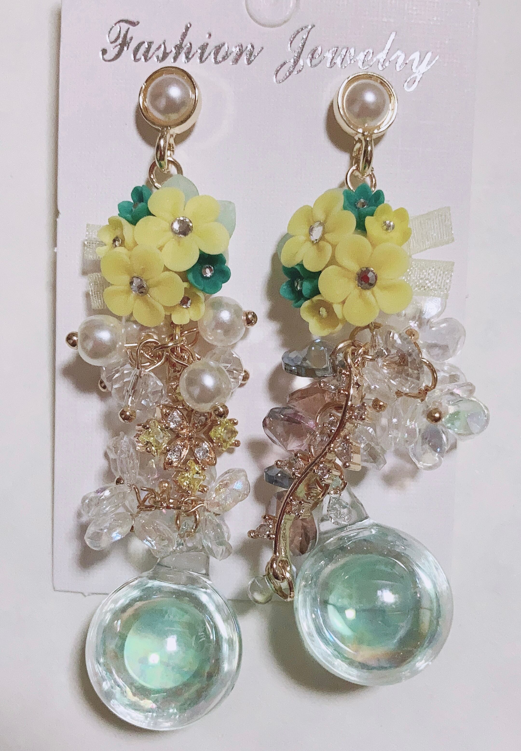 樹脂のお花、パール、シャボンビーズを使って作りました